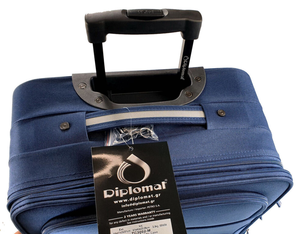 Η Diplomat ZC3002-M είναι μια μεσαία υφασμάτινη βαλίτσα, ιδανική για ταξίδια εντός και εκτός Ελλάδας. Διαθέτει ελαφριά κατασκευή και ανθεκτικότητα, με διάσταση 64cm και επέκταση +5cm, που καλύπτει το επιτρεπόμενο βάρος 23 κιλών για τις περισσότερες αεροπορικές εταιρείες.